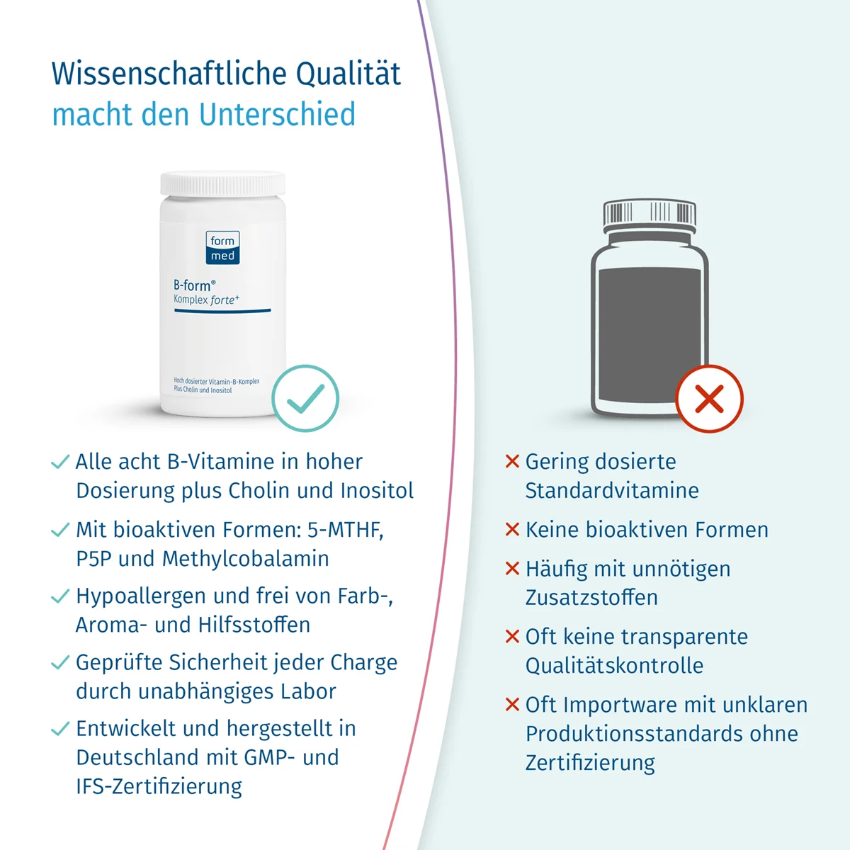 B-form® Komplex forte+ ist durch die höhere Dosierung besonders geeignet, wenn Sie ein Präparat mit extra starker Wirkung möchten, um Ihre Vitamin-B-Speicher schnell aufzufüllen und einen nachgewiesenen Mangel an B-Vitaminen schnell auszugleichen. Die außergewöhnlich hohe Qualität ist typisch für FormMed!
