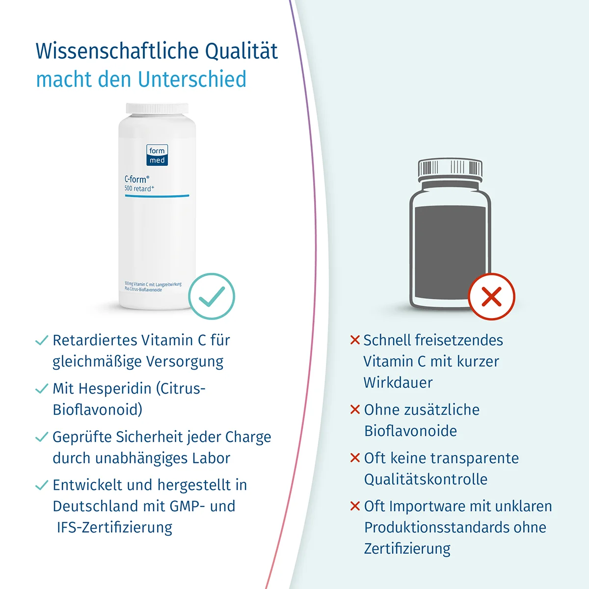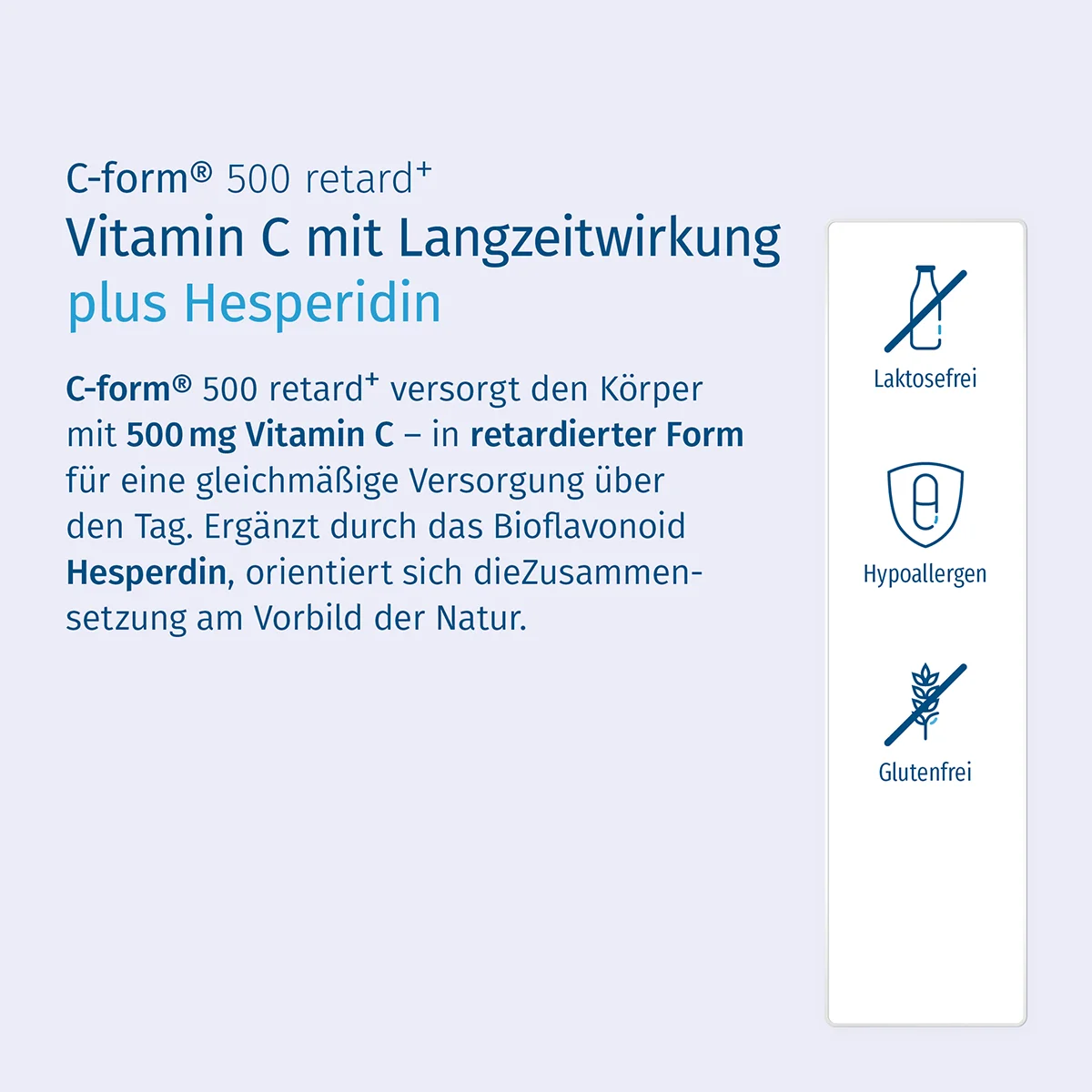 C-form® 500 retard+ ist unsere Empfehlung, wenn Sie eine gleichmäßige Langzeitabgabe von Vitamin C über den Tag wünschen. Das Vitamin C ist in kleine Pellets verpackt. Es löst sich nach und nach im Darm auf und wird so über einen längeren Zeitraum gleichmäßig an den Körper abgegeben. Das hochwertige Präparat enthält 500 mg des Vitamins und darüber hinaus Citrus-Bioflavonoide.